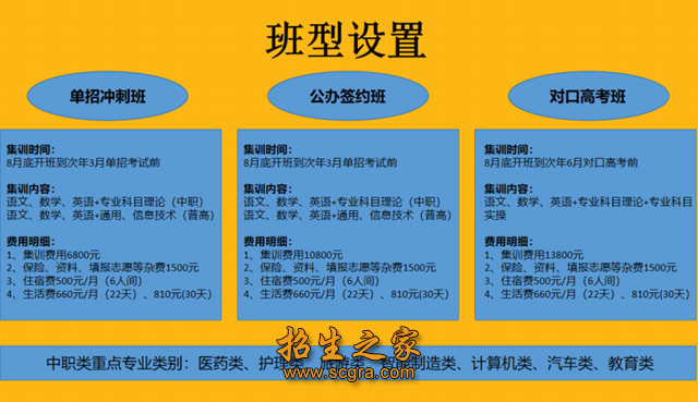 收费标准:冲刺班6800元、签约公办班10800元、对口高考班13800元。
